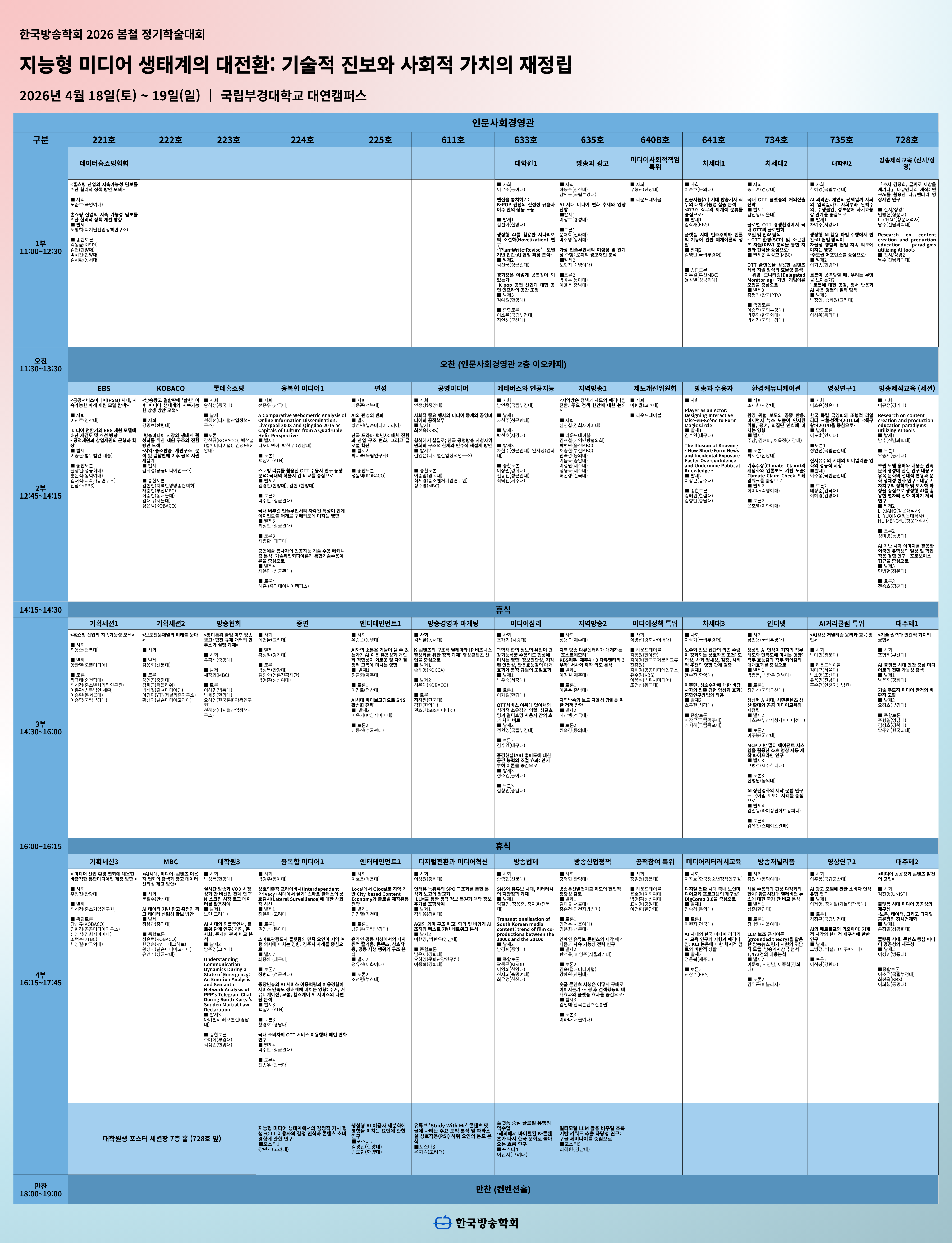 2. 한국방송학회는 2026년 4월 18일(토) ~ 19(일) 국립부경대학교에서 개최되는 <2026 봄철 정기학술대회>의 1차 세션표를 다음과 같이 공지합니다.