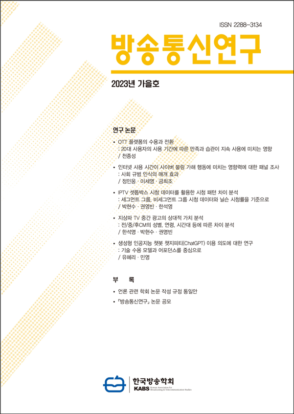 3. <방송통신연구> 2023년 가을호(통권 제124호) 논문은 방송학회 홈페이지의 ‘논문통합검색’에서 논문을 내려받아 읽으실 수 있습니다.
