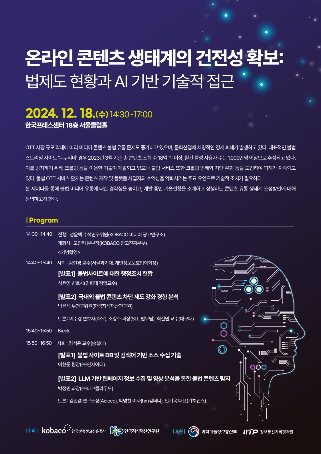 14:40~15:40 | [발표 1] 불법사이트에 대한 행정조치 현황 - 성원영 변호사(경희대학교 겸임교수) [발표 2] 국내외 불법 콘텐츠 차단 제도 강화 경향 분석 박윤석 부연구위원(한국지식재산연구원) [토 론] 이수경 변호사(법무법인 화우) 조항주 과장(SLL 법무팀) 최진원 교수(대구대학교) |