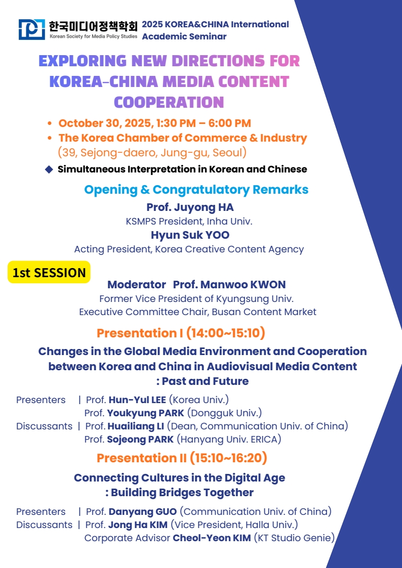 2. 한국미디어정책학회에서 <한·중 미디어콘텐츠 교류의 새로운 방향 모색>을 주제로 다음과 같이 세미나를 개최합니다. 회원 여러분의 많은 관심을 부탁드립니다.
