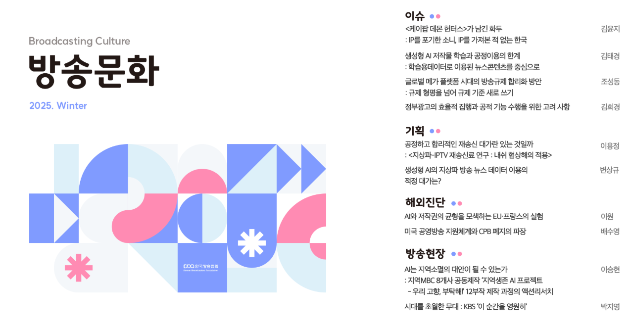 2. 한국방송협회 방송문화 2025년 겨울호를 다음과 같이 안내드립니다. 회원님들의 많은 관심 부탁드립니다.