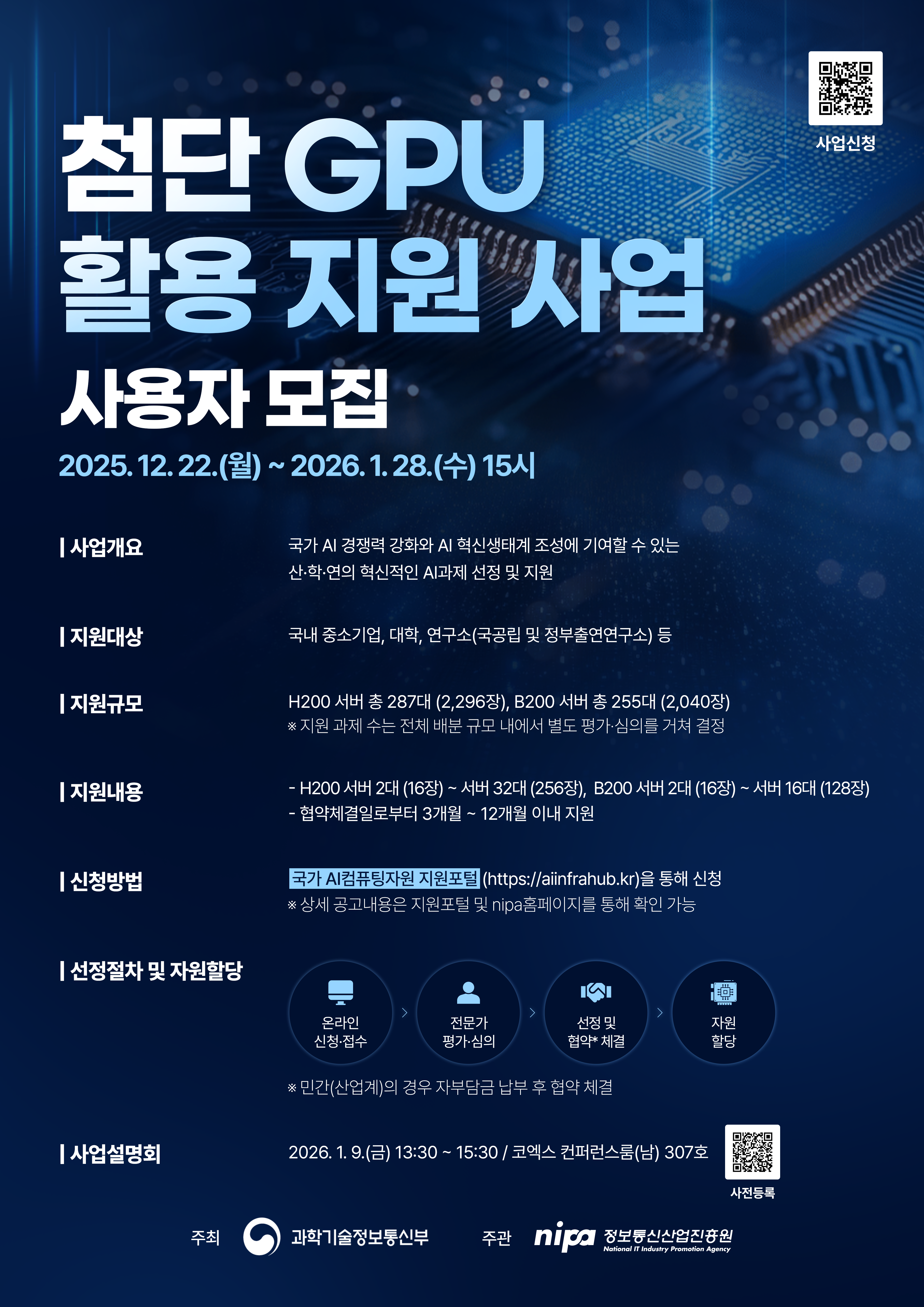 2. 한국정보방송통신대연합에서 <첨단 GPU 활용 지원 사업> 사용자 모집 및 사업설명회를 개최합니다. 회원님들의 많은 관심 바랍니다.