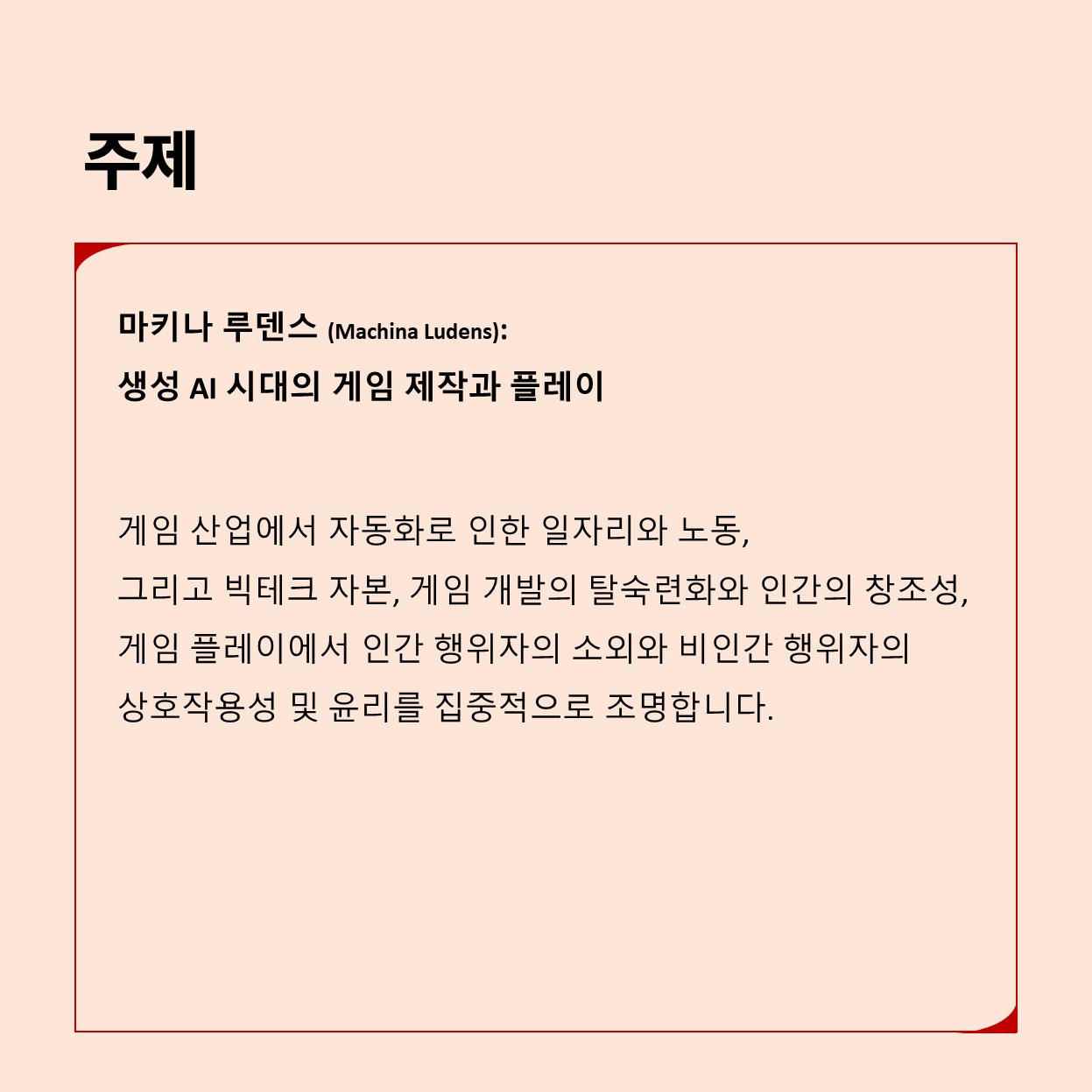AI의 등장으로 인해 게임 산업과 문화 모두 급진적인 단절과 전환을 맞이하고 있습니다. AI가 무어의 법칙을 7배 이상 속도로 앞지르면서, 전 지구의 사이버 네틱스는 거대 언어모델과 클라우드의 연산처리를 위해 총동원되는 중입니 다. 비대해진 사이버네틱 순환 복합체(Cybernetic Circulation Complex)를 게임과 떼어놓고 생각할 수 없습니다. 게임을 구동시키는 핵심 요소인 GPU 와 희토류는 모두 AI의 필수 재료이기도 합니다. 또한 생성 AI와 거대 언어모 델이 보편화되면서, 게임 개발에서의 테일러화(Taylorisation)와 탈숙련화 (Deskilling)가 동시에 가속되고 있습니다. 한편 게임 속에서 인간 행위자인 플 레이어와 AI 기반 ‘생성행위자(Generative Agent)’가 상호작용하는 새로운 플 레이 문화가 나타나는 중입니다. 본 학술대회에서는 AI와 결부된 게이밍의 행 위성을 탐구합니다. 구체적으로는 게임 산업 에서 자동화로 인한 일자리와 노 동, 그리고 빅테크 자본, 게임 개발의 탈숙련화와 인간의 창조성, 게임 플레이 에서 인간 행위자의 소외와 비인간 행위자의 상호작용성 및 윤리를 집중적으 로 조명합니다. 개발자, 연구자, 비평가, 그리고 게임에 관심을 갖고 있는 모든 분들의 적극적인 참여와 관심을 부탁드립니다.
