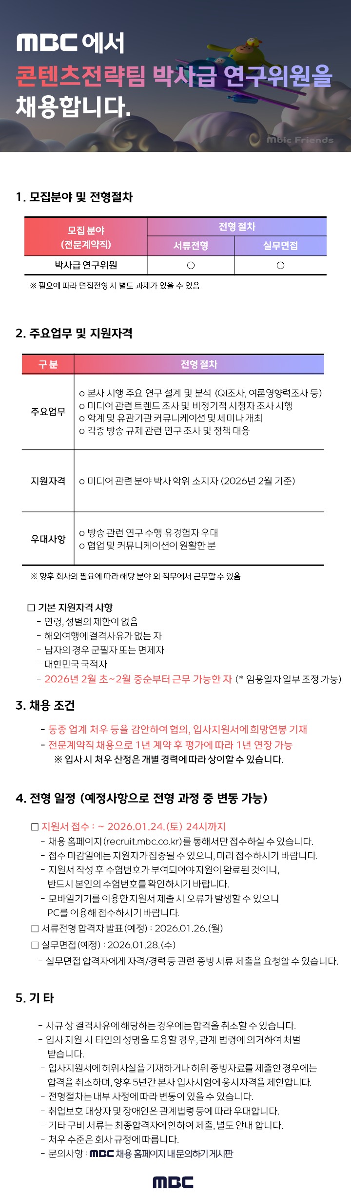 MBC에서 콘텐츠전략팀 박사급 연구위원을 채용합니다.