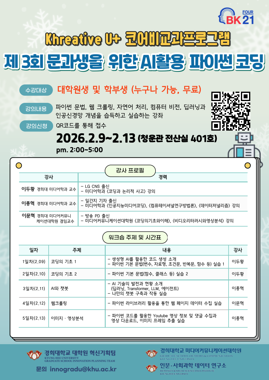 2. 경희대학교 <미디어커뮤니케이션대학원>과 <인문·사회과학 데이터연구소>는 공동으로 '문과생을 위한 AI활용 파이썬 코딩' 이라는 주제로 다음과 같은 프로그램을 개최합니다. 프로그램에 관심 있는 회원 누구나 가능하며 무료로 진행합니다.. 회원님들의 많은 관심과 참여 바랍니다.