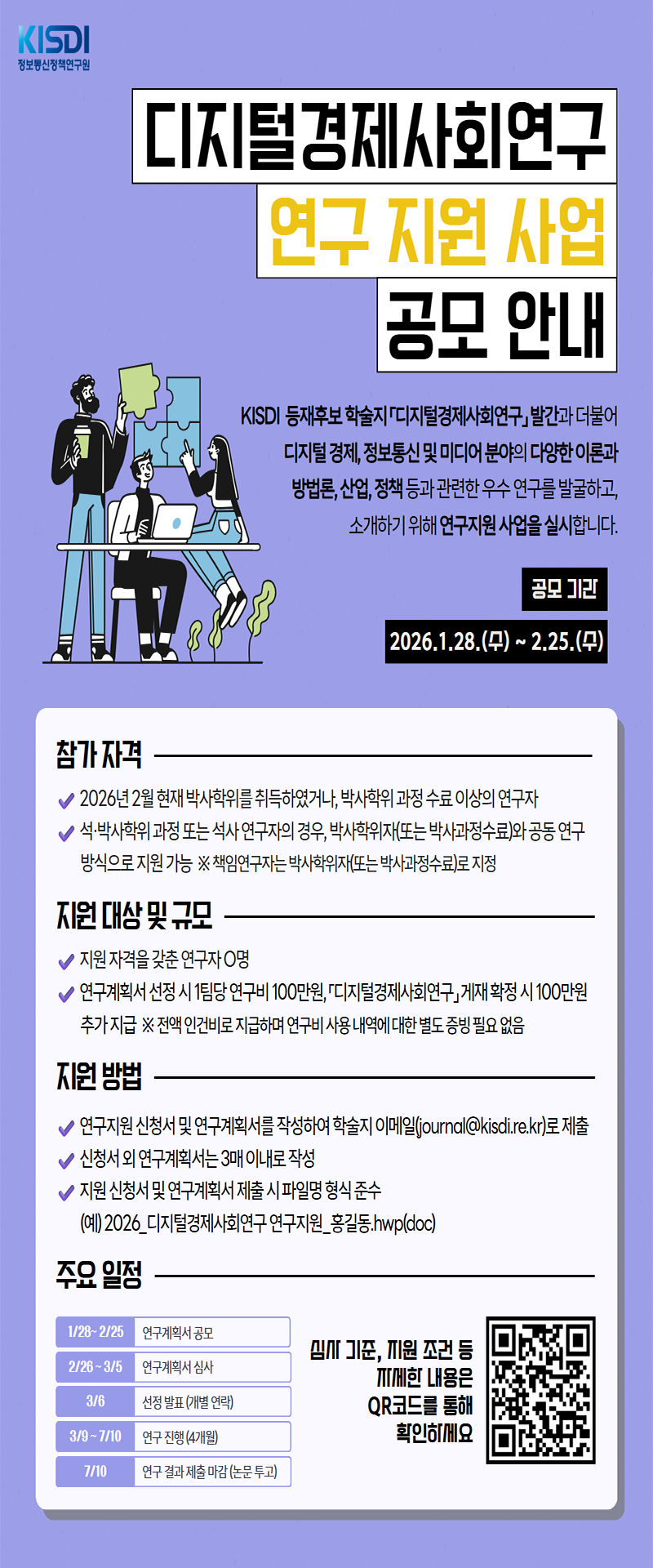 - 연구계획서 선정 시 1팀당 연구비 100만원, 「디지털경제사회연구」 게재 확정 시 100만원 추가 지급
