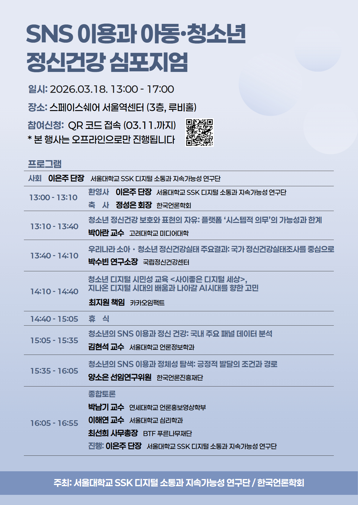 2.서울대학교 SSK 디지털 소통과 지속가능성 연구단과 한국언론학회 공동 주최로 <SNS 이용과 아동·청소년 정신건강> 심포지엄을 다음과 같이 개최합니다. 회원님들의 많은 관심 부탁드립니다.