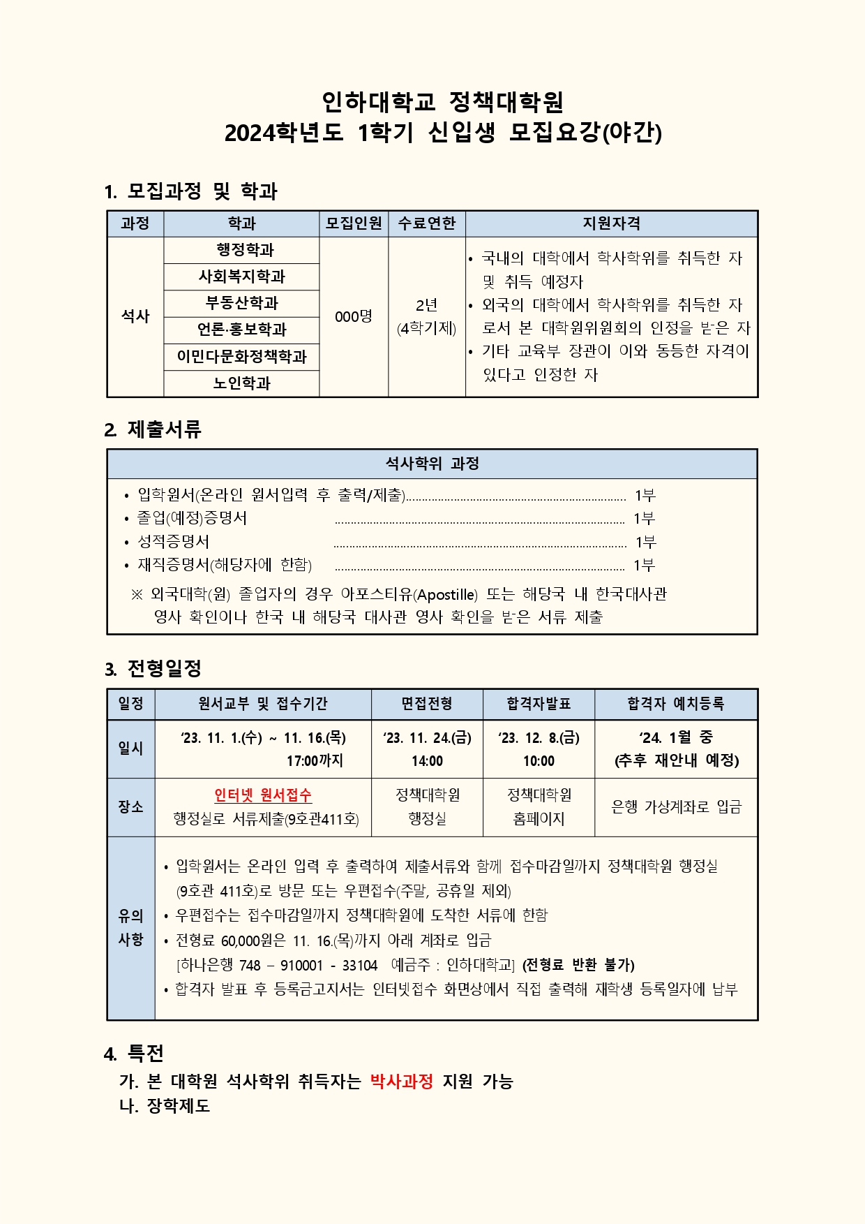 2. 인하대학교 정책대학원(야간) 2024학년도 1학기 신입생 모집을 다음과 같이 안내해 드리니, 회원 여러분의 많은 관심 바랍니다.