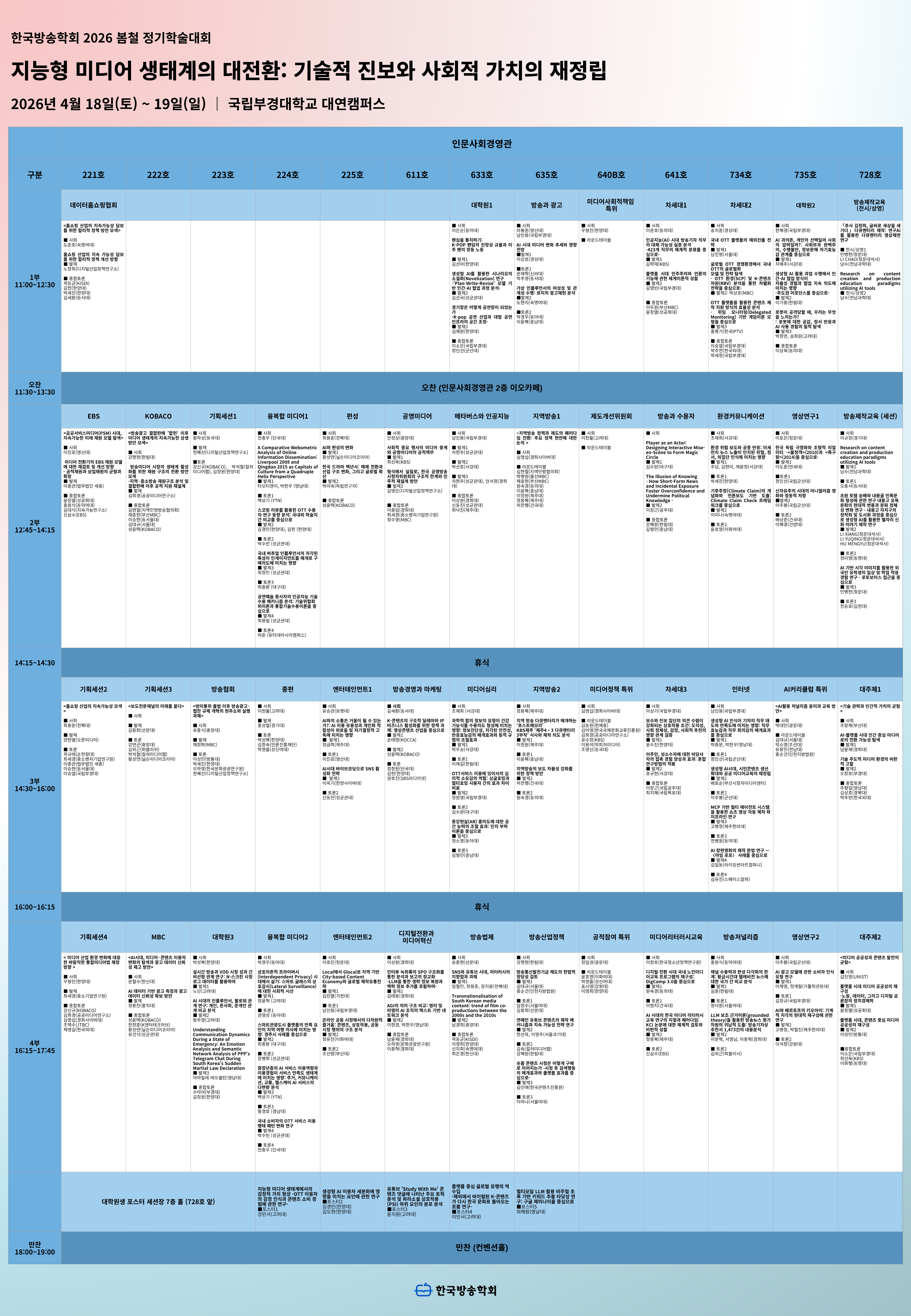 2. 한국방송학회는 2026년 4월 18일(토) ~ 19(일) 국립부경대학교에서 개최되는 <2026 봄철 정기학술대회>의 1차 세션표를 다음과 같이 공지합니다.