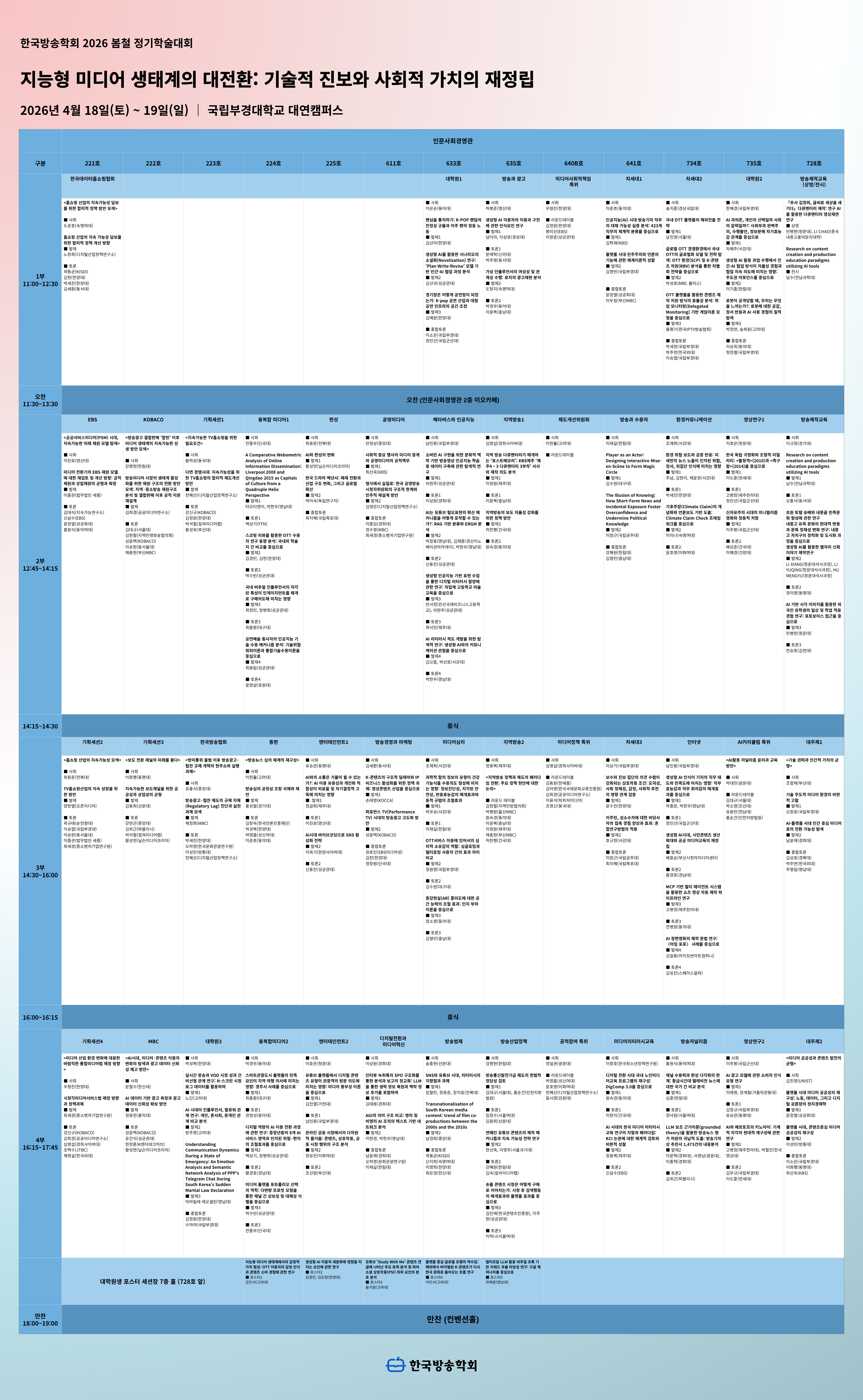 2. 한국방송학회는 2026년 4월 18일(토) ~ 19(일) 국립부경대학교에서 개최되는 <2026 봄철 정기학술대회>의 최종 세션표를 다음과 같이 공지합니다.