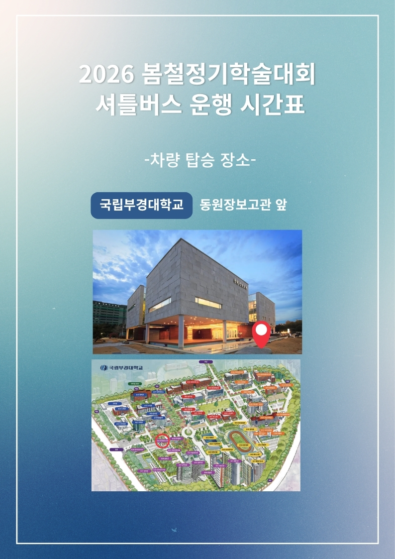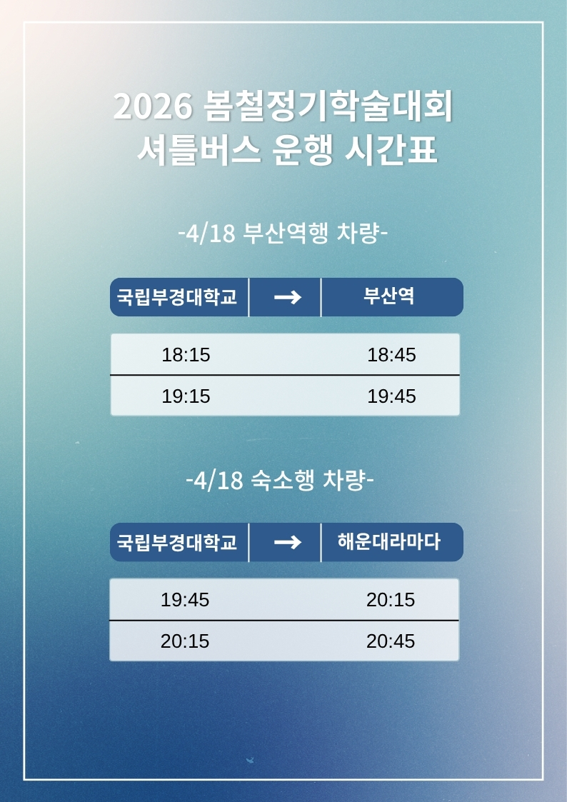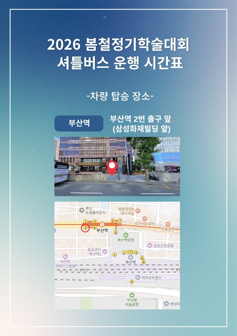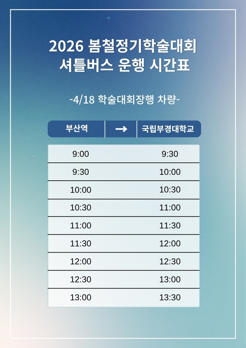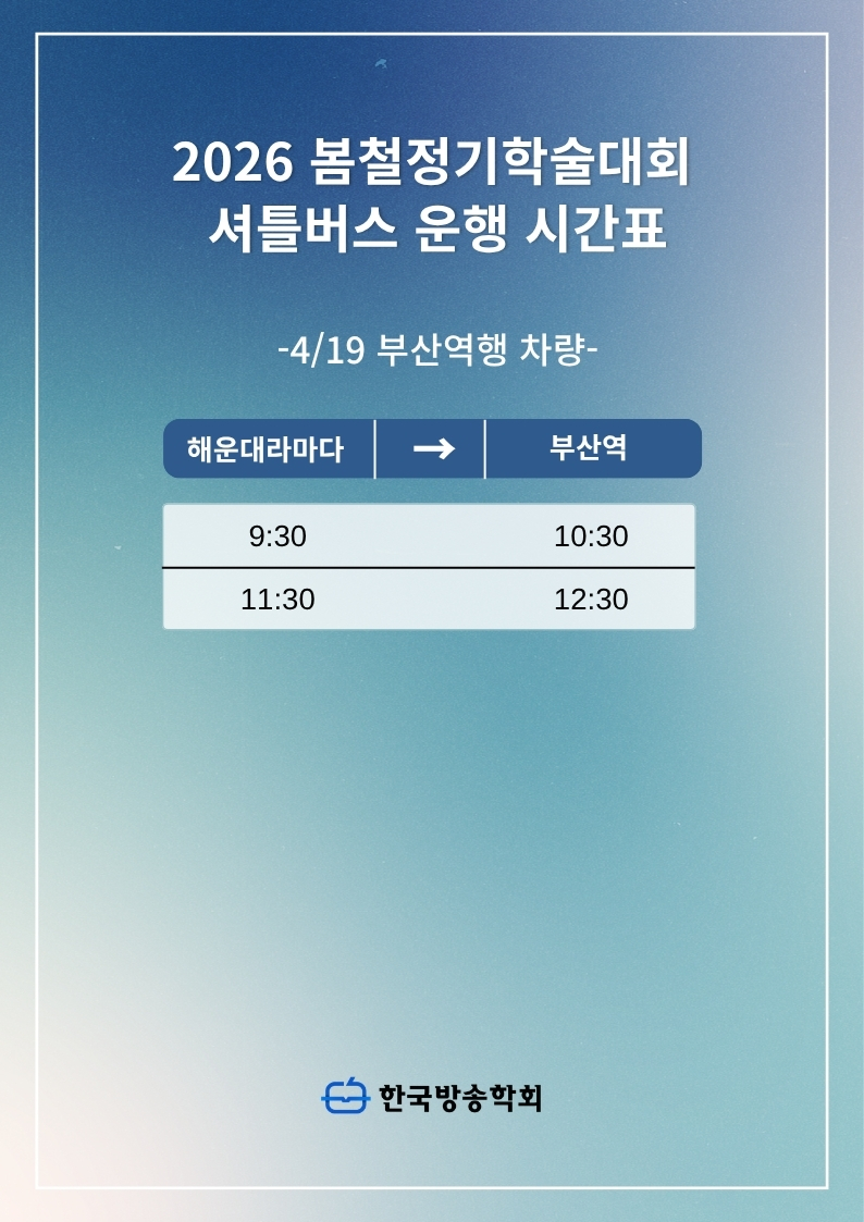 2. 한국방송학회는 2026년 4월 18일(토) ~ 19(일) 국립부경대학교 대연캠퍼스에서 개최하는 <2026 봄철 정기학술대회>의 셔틀버스 운행 시간을 다음과 같이 안내합니다.