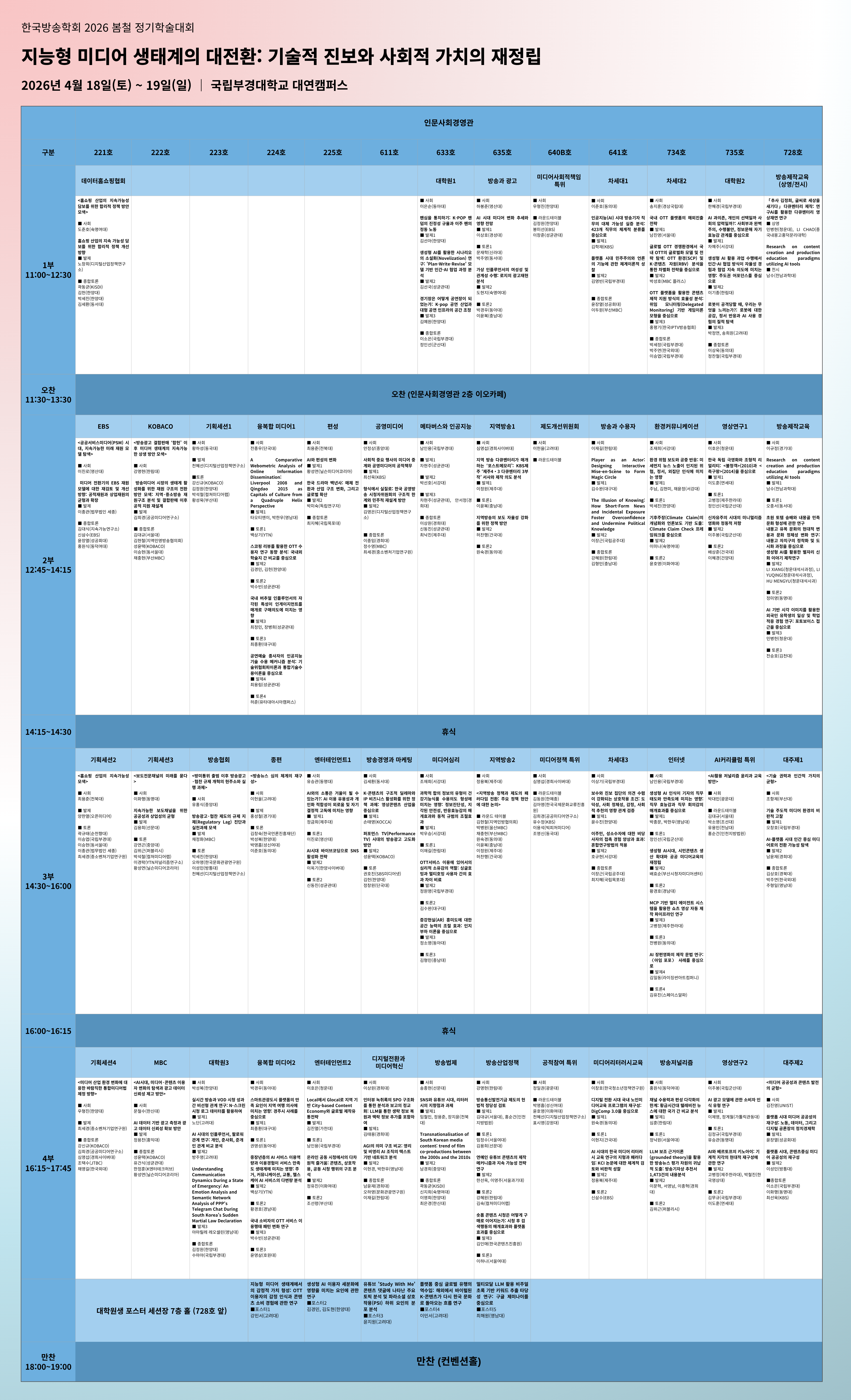 2. 한국방송학회는 2026년 4월 18일(토) ~ 19(일) 국립부경대학교에서 개최되는 <2026 봄철 정기학술대회>의 2차 세션표를 다음과 같이 공지합니다.