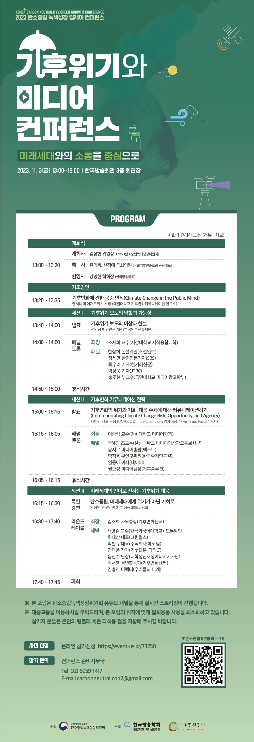 현재 우리는 자연을 매개된 환경으로 수용하고 있습니다. 이는 자연이 미디어이며, 자연을 재현, 표상하는 미디어 환경에 대한 미디어커뮤니케이션 전문가들의 역할이 더욱 중요해지고 있다는 것을 의미합니다. 이에 방송학회에서는 환경커뮤니케이션연구회와 탄소중립녹색성장위원회가 공동으로 <기후위기와 미디어>라는 주제로 기후위기·탄소중립에 대한 관심과 전문성을 가진 학계와 언론계, 환경전문가들이 참여하여 기후위기에 관한 미디어 공론장을 마련하여 관련 논의를 활성화하는 자리를 마련했습니다. 특히, 이 행사는 기후위기와 환경정의의 주축이 될 미래세대의 관심과 참여를 높이는 뜻깊은 자리가 될 것입니다. 관심 있는 학회원 여러분들의 많은 관심과 참여 부탁드립니다.